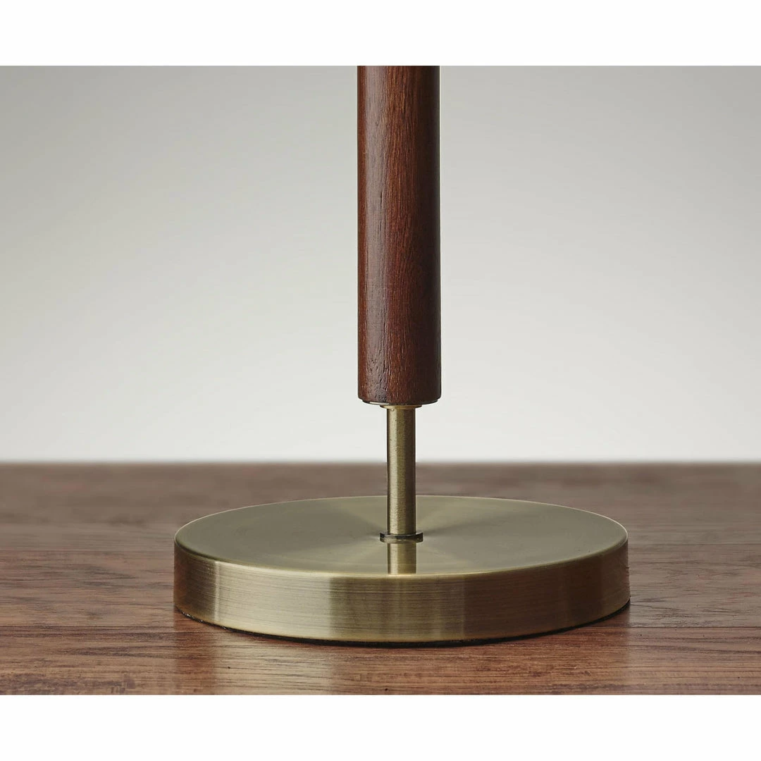 A good candidate for urban or mid-century settings, the Harriet table lamp has a modern form warmed by a walnut eucalyptus wood and antique brass finishes. A 100 Watt incandescent bulb or an equivalent CFL shines beautifully through a natural, linen fabric shade. A brass pull chain switch turns the lamp on and off. This lamp has a clear cord and is smart outlet compatible.