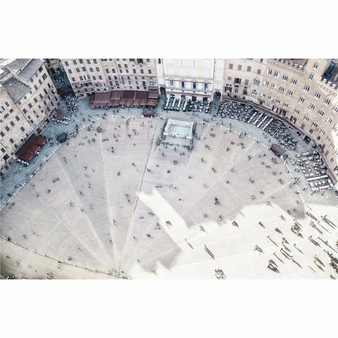 A dynamic aerial photograph of the principal public space of Sienna, Tuscany in Italy. This shell shaped, blush toned, 13th century piazza is printed on a contemporary acrylic.