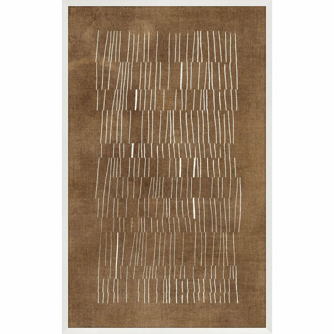 This impactful series on a linen ground has a great mid-century vibe. Beautifully finished in a deep frame with white and warm woodtones to really complement these pieces.