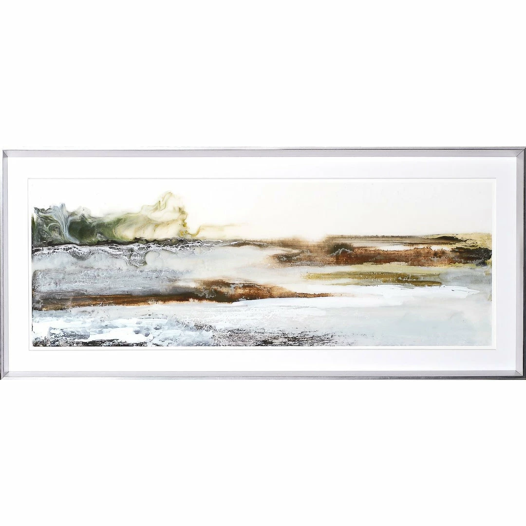 The inspiration for this provocative, water medium seascape is the shifting sands of some mythical shore. Ferdos Maleki uses soft textures and shifting light to create these ethereal beauties. Framed in a sleek, angular silver frame with double thick , raised matte.