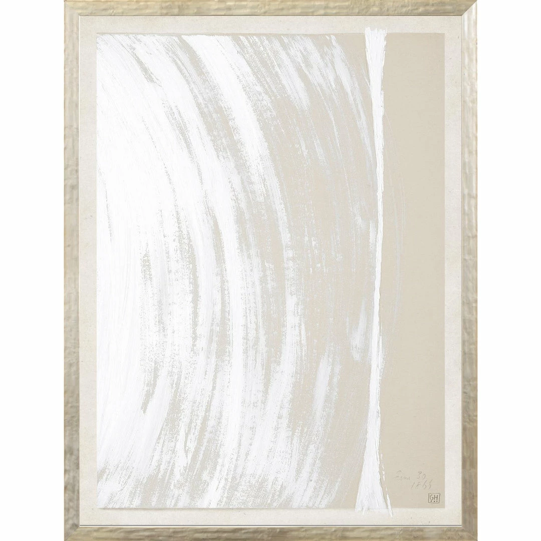 This intriguing series of white-on-neutral drawings of playful shapes and images are executed on restoration paper to add an extra depth and interest. White paint and pencil generate an eclectic group in two sizes. Framed in a delicate, warm silver mottled profile. So many possibilities with 24 images, in 2 sizes to play with.