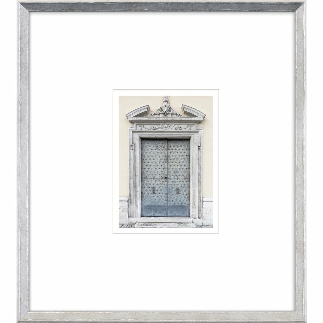 These beautiful European architectural doors and windows are reminders of a time when skilled masons, carpenters and ornamental plasterers were revered. They expressed the Georgian, Greek, Rococo and Renaissance styles with soft pastel tones in their elaborate decoration. The subtle color allows the detail to really stand out. The image is set under a raised matte with a glacier white matting with silver edges and welded design.