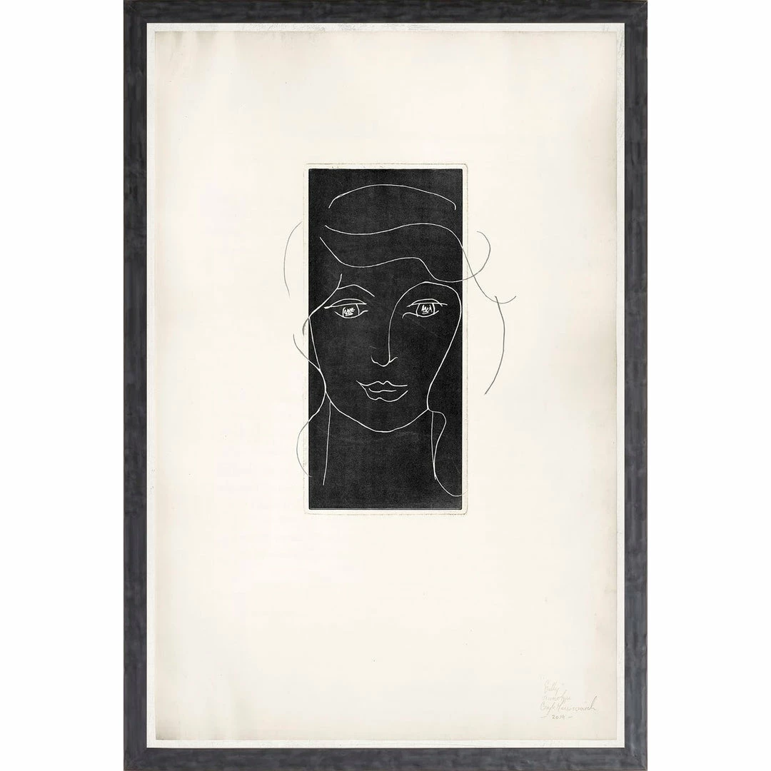 The simplicity of the Picasso style line drawings is in the well thought-out simplicity of the simple line. This simple portrait speaks volumes, complimented with a satin black, softly rippled profile.