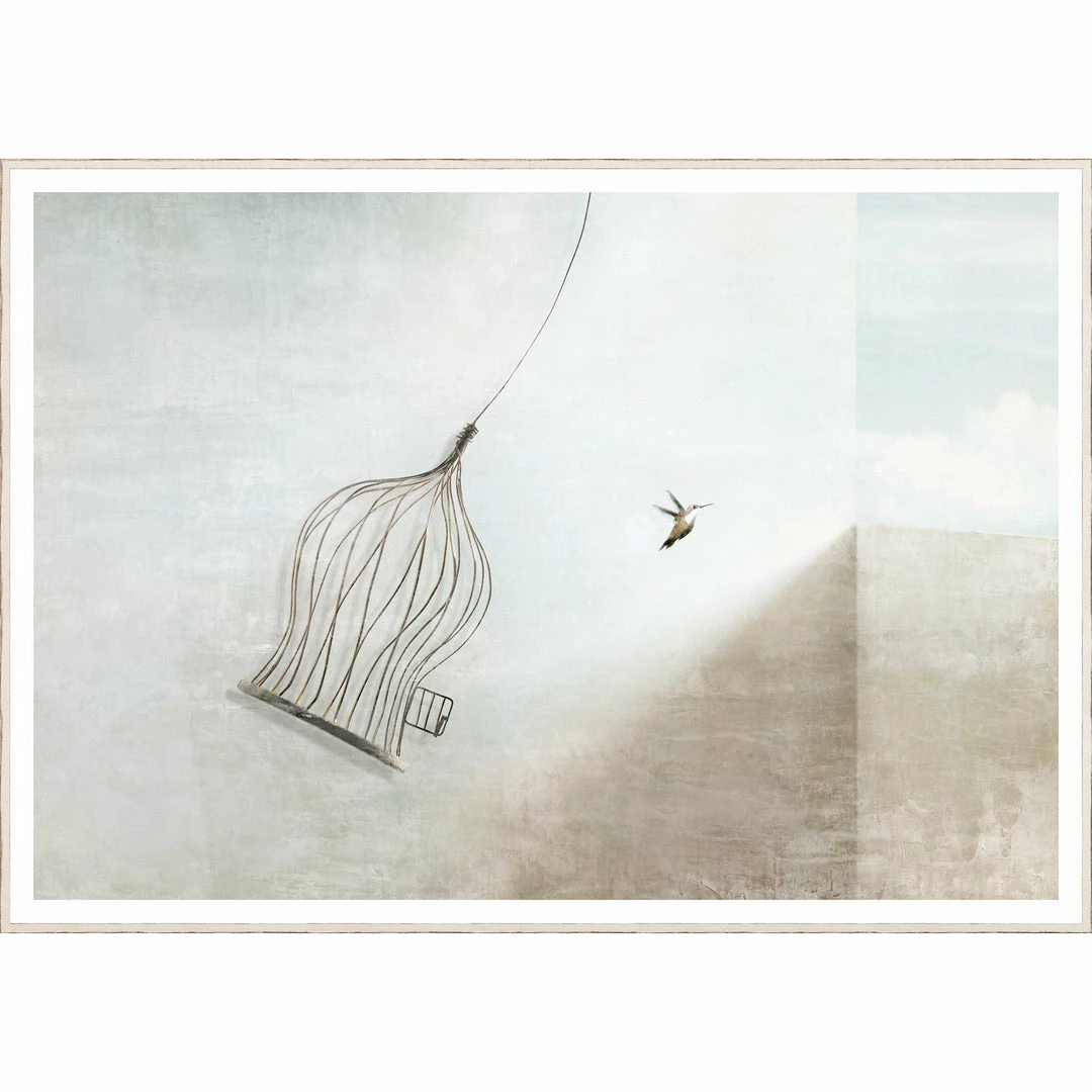 A dream-like image of a small bird escaping from a curious cage. Framed with a distressed white painted moulding.
