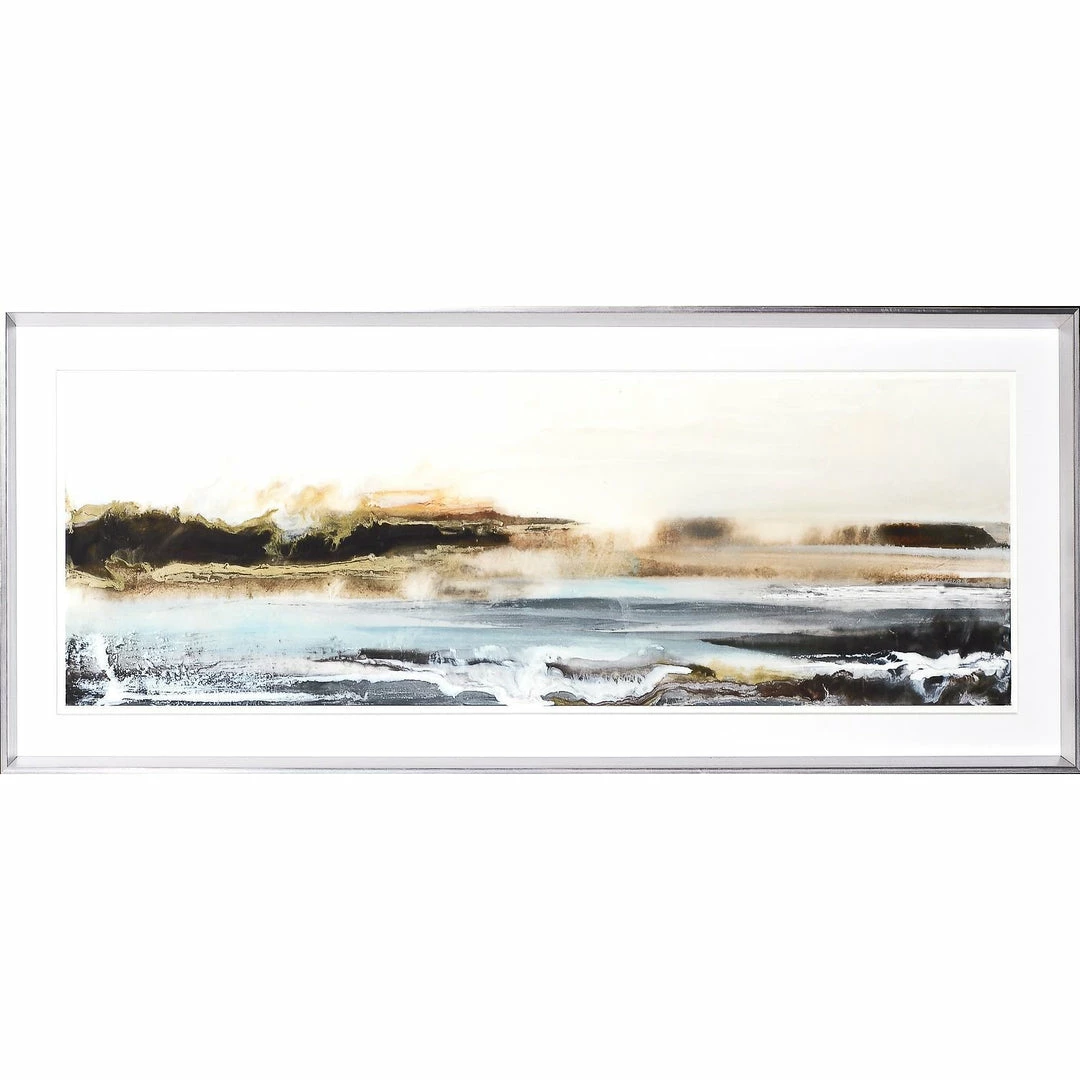 The inspiration for this provocative, water medium seascape is the shifting sands of some mythical shore. Ferdos Maleki uses soft textures and shifting light to create these ethereal beauties. Framed in a sleek, angular silver frame with double thick , raised matte.