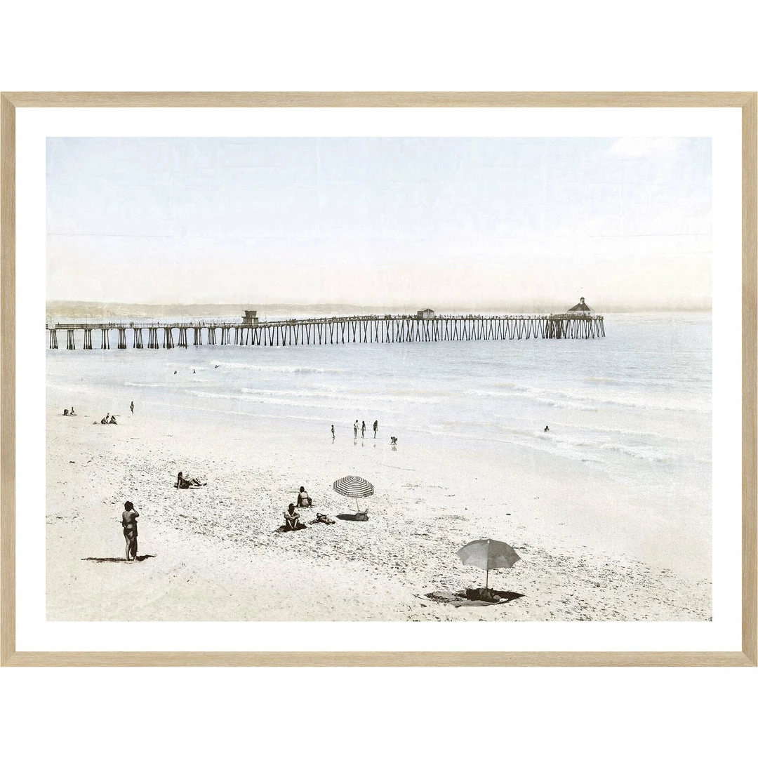 This photograph shows beachgoers enjoying the sand and surf, as well as the iconic wooden pier. Framed in a natural wooden frame.
