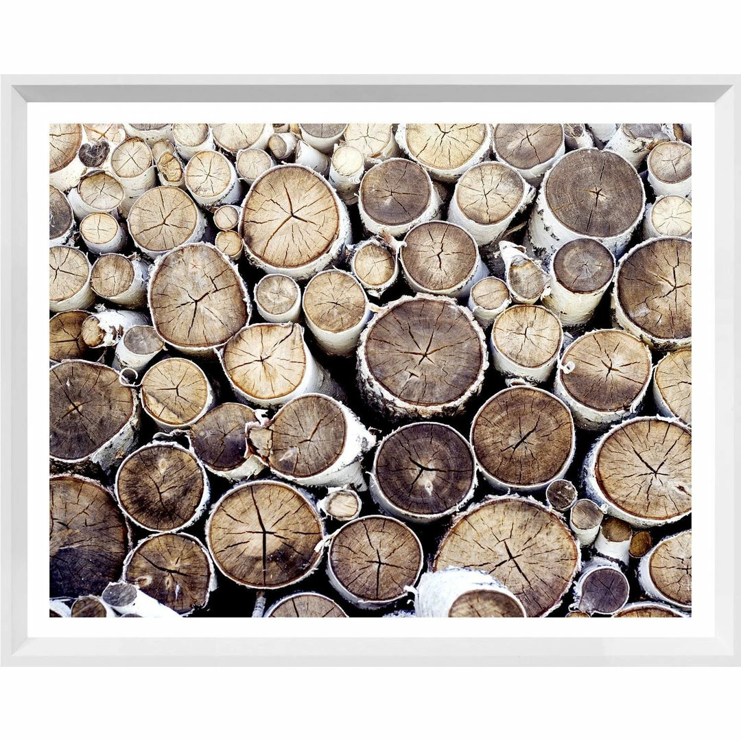 Modern Farmhouse art of stacked rustic birch logs.