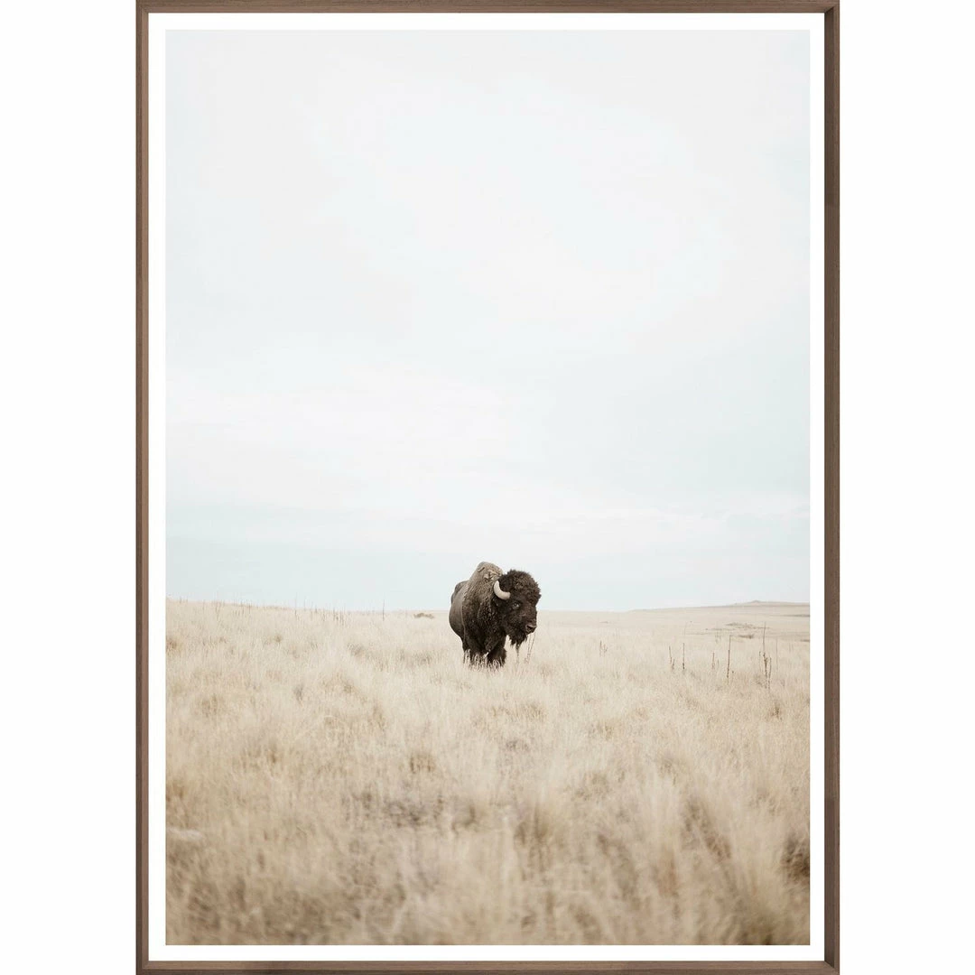 The magnificent Buffalo, or sometimes known as Bison, stands out against the wide plains he once dominated. He seems to challenge you to honour his presence. Minimally framed in a contemporary angled, gray washed profile in large size.