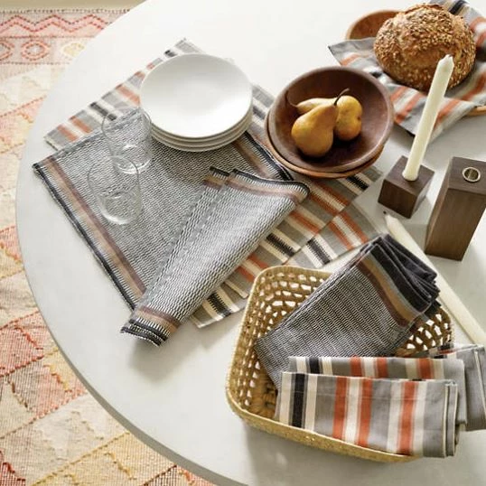 For some graphic traffic on your table look no further than our oversized, handwoven cotton tea towels in a rhythmic checkered stripe of Ivory, Camel and Java. Generously sized for total lap protection.