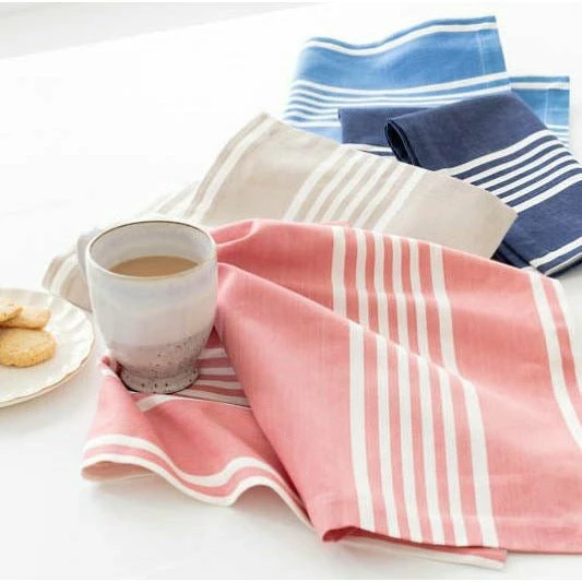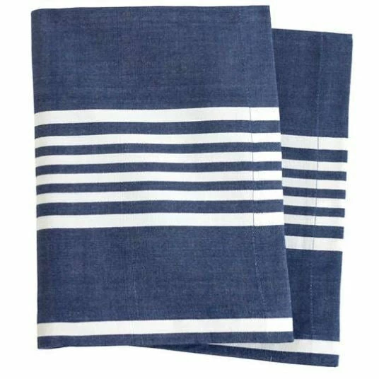 Happy colors and chic stripes give our oversized, handwoven, softly laundered cotton tea towels their tabletop brightening style. In Indigo colored woven stripes.