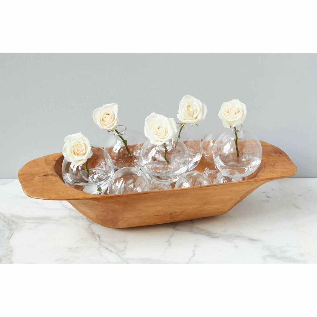 Handcrafted by European artisans, the vintage-inspired Dough Bowls were inspired by those that were once used for making and kneading dough. Redesigned for the modern home, the dough bowls have a natural wood finish. Each wooden bowl is handcrafted from reclaimed wood, therefore maintaining its authentic markings and carvings. The artisanal nature of each small bowl makes it a special and contemporary accent for your kitchen or home.