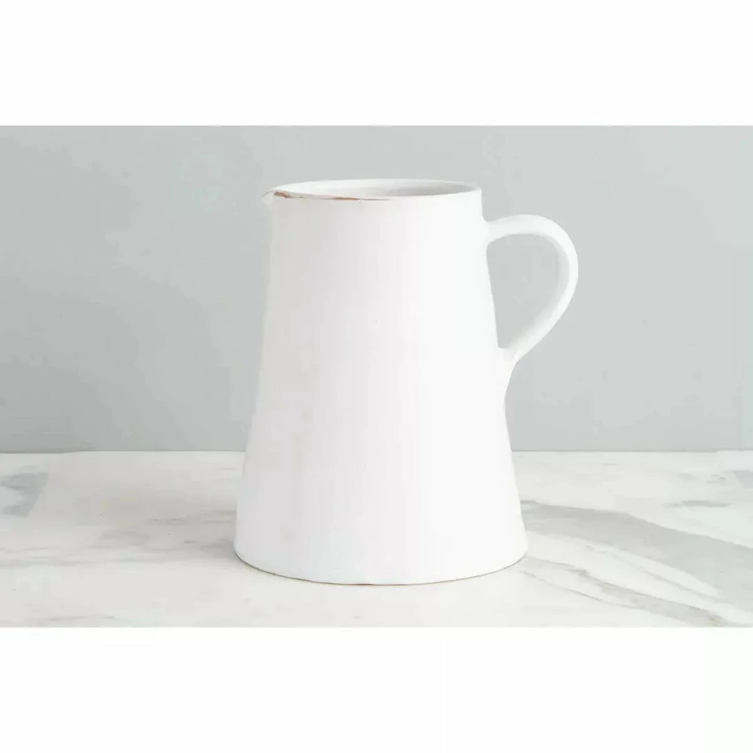 Add a touch of elegance and southern French charm to your kitchen décor with the large White Water Jug. Inspired by the traditional countryside jug, the shape of this water jug has been updated for a modern look. Turned by hand on the potter’s wheel using 19th century methods, each water jug is finished by hand with a white terracotta glaze. Designed with a single handle for ease of serving, this water jug can also be used as vase to display potted plants. Care Instructions: Wash by hand.