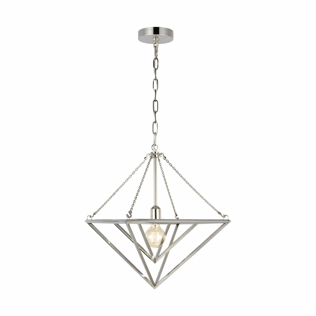 The Carat Pendant features a diamond shape with geometric embellishments giving it a new and modern feel perfect for any room. Available in three sizes with a Burnished Brass or Polished Nickel finish. Damp locations.