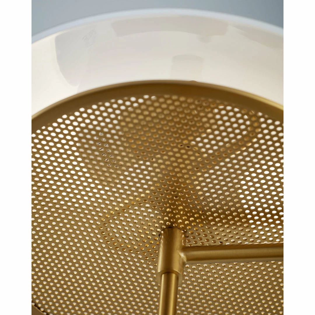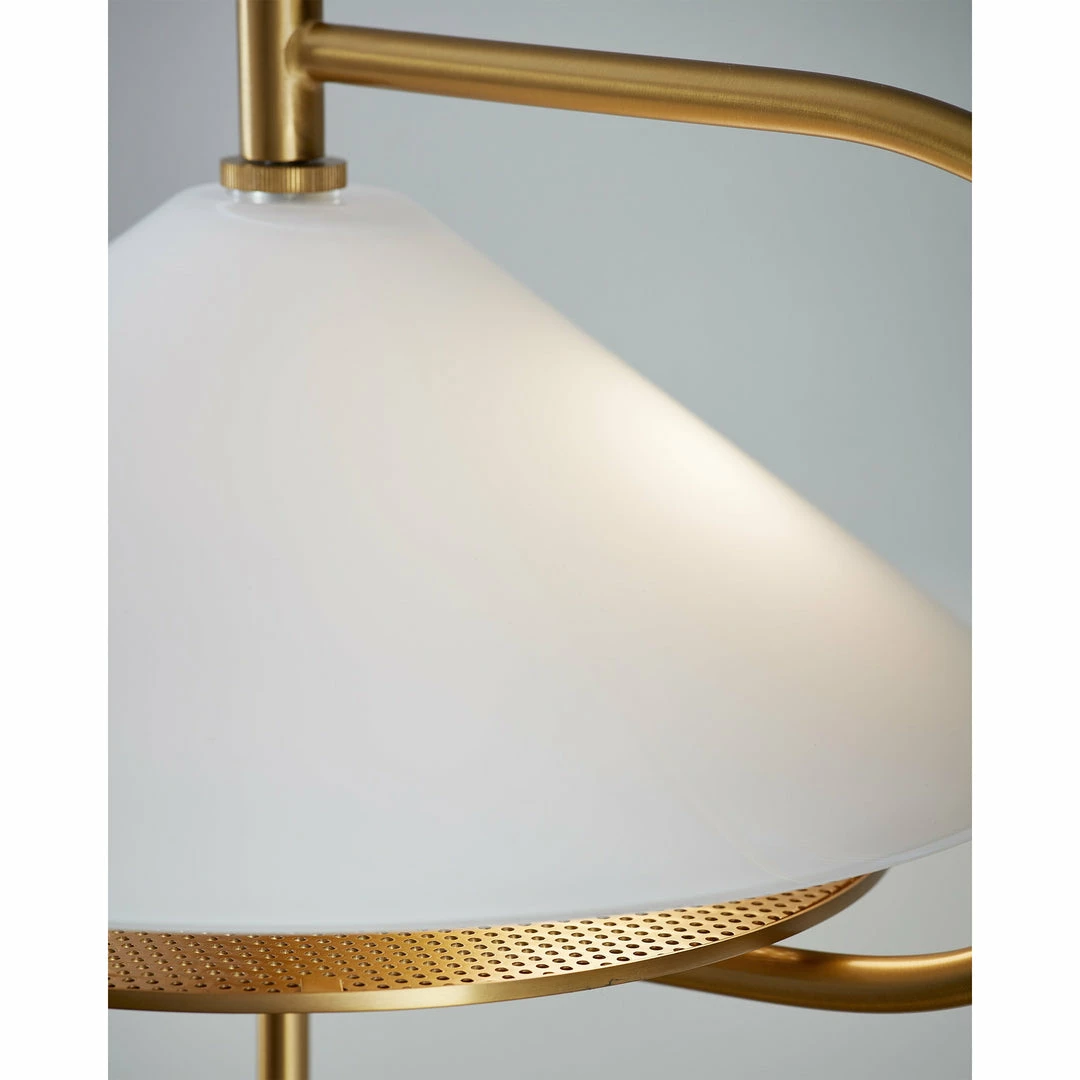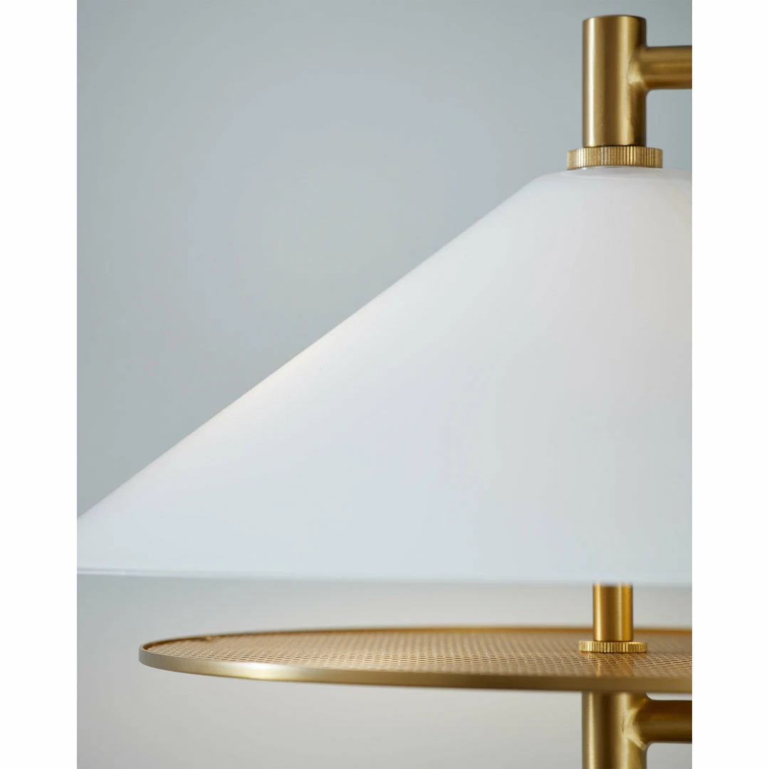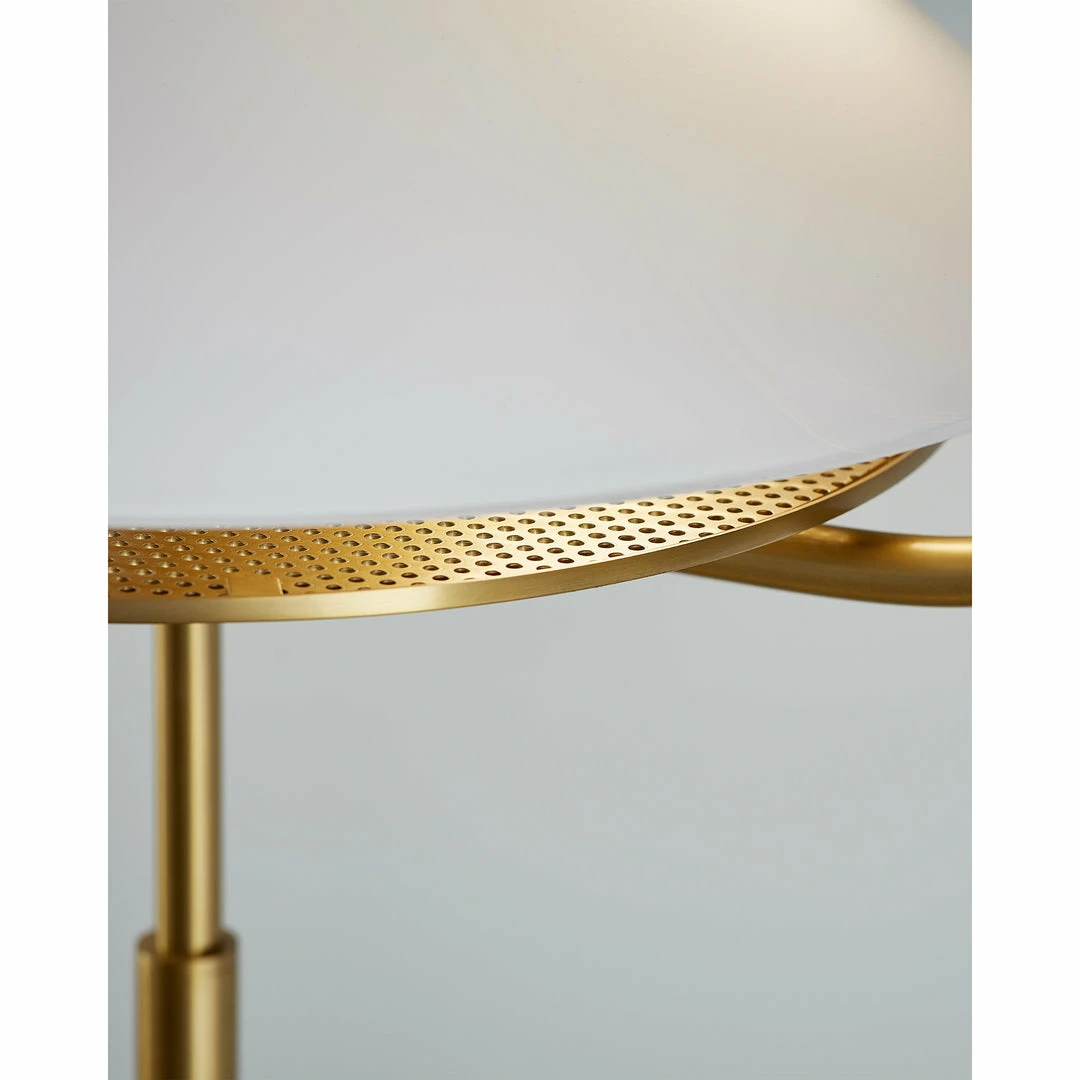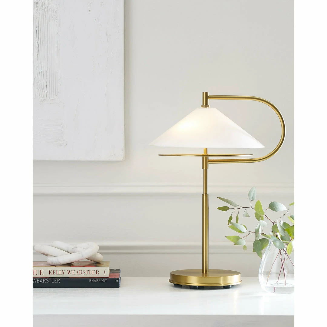 The Gesture Table Lamp from Kelly by Kelley Wearstler sets a relaxed tone with a vintage, modern personality. It gestures over a table in elegant contours. The slenderness of the metal structure complements the open, airy feel of a room. Wearstler creates an eye-catching play of contrasts with the metal and the white glass shade. The tapered shade suggests the direction of the light in an attractive silhouette. The light fans out the opening as a generous spread and filters through the glass for a pleasant ambiance.
