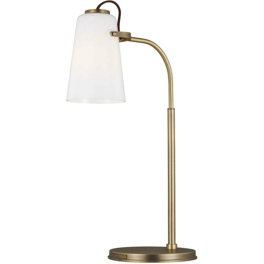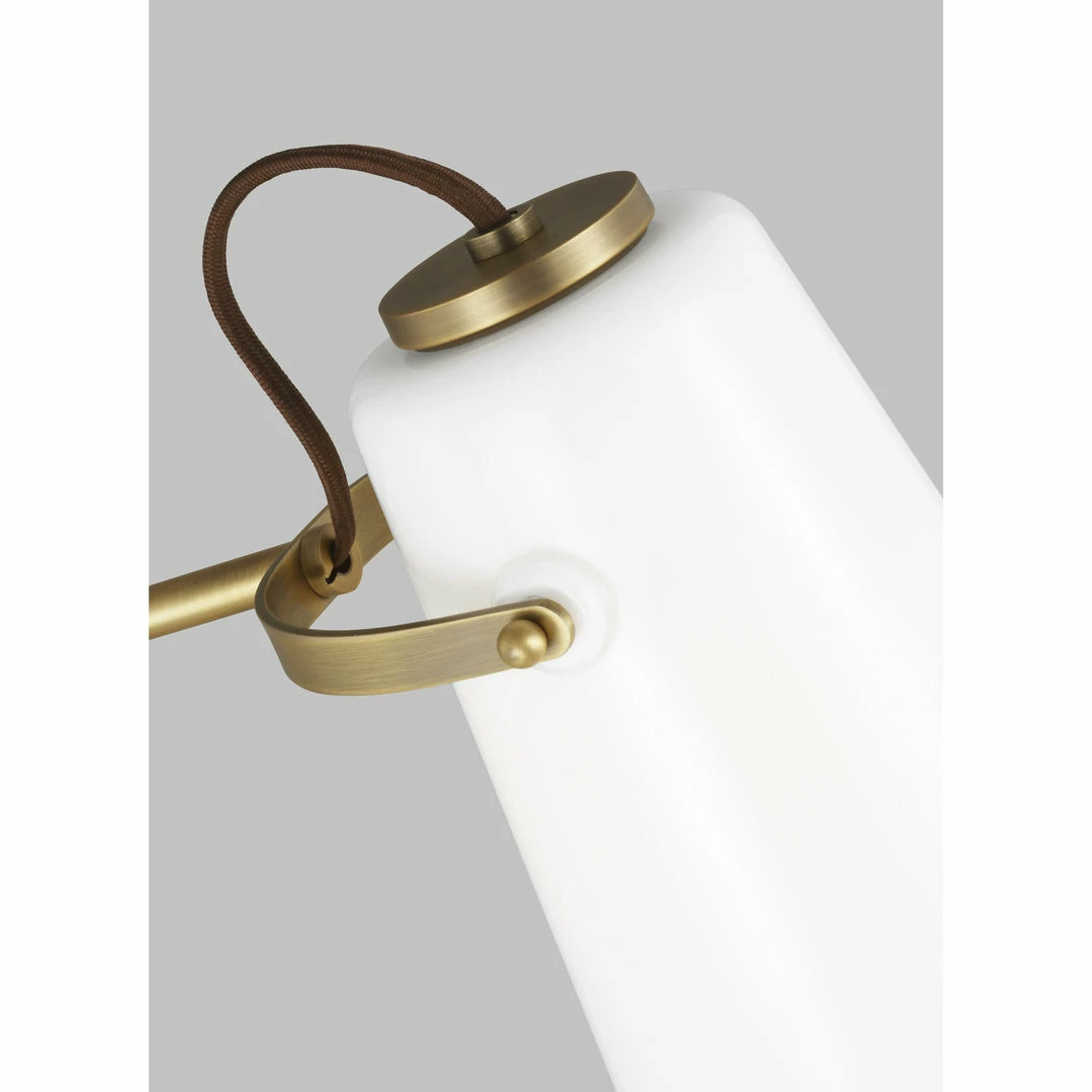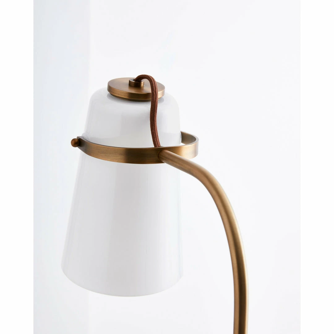 Hazel updates an industrial form with elegant white milk glass. Branded canopy detailing and an exposed fabric black cord creates a refined foundation for modern living. The curved metal above the shade draws inspiration from the stirrups on a horse or saddle.