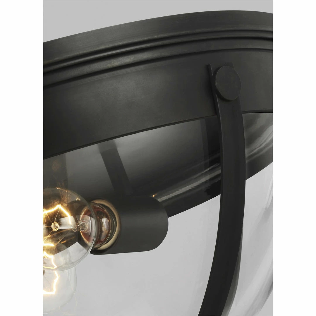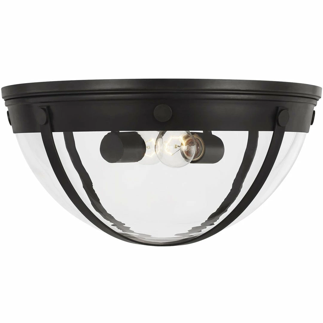 The Logan Flush Mount offers a sleek look with a touch of retro flair, featuring a Clear glass dome shade set into a round steel frame accented with bars crisscrossing across the shade. Available finished in Aged Iron or Polished Nickel. UL and cUL listed for damp locations.