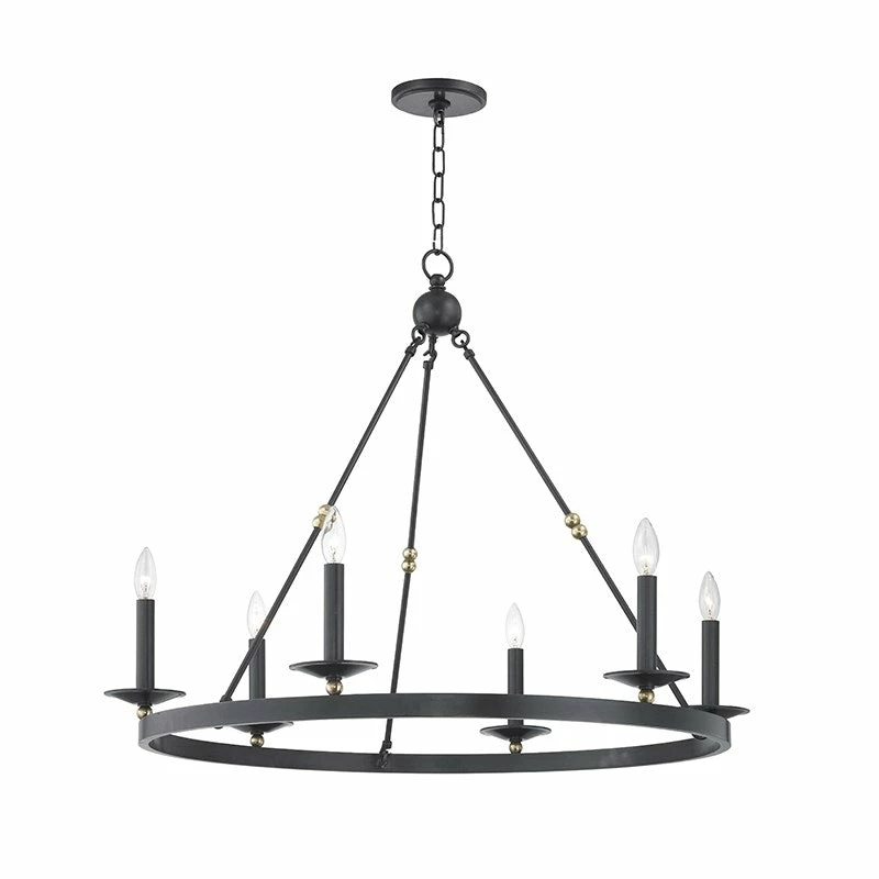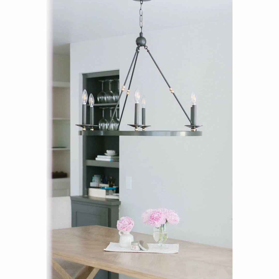 Streamlining a wagon-wheel chandelier with hook-and-hoop rods, Allendale breathes new life into a classic. Available in one-to-three-tier and rectangle versions, its sphere details and vastly different finishes refine the rustic.