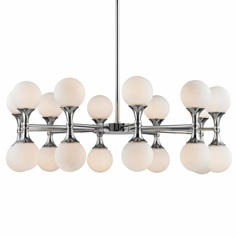 Delight in simplicity and symmetry in our Astoria family. Bubbles of light balance on and balloon forth from trumpets of cast metal. Opal-etched glass diffusers poise in balanced rows, above and below, along a wheel of light, concealing warm, dimmable LED bulbs.