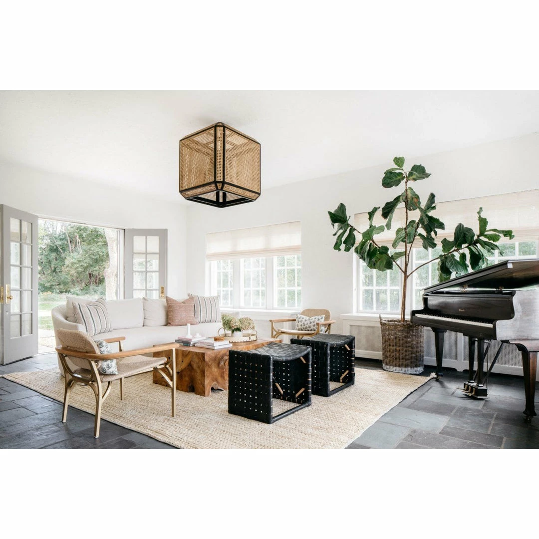 The Georgia family evokes the comforts of home. Rattan lattice cane deftly woven in geometric boxy shapes conceals light sources in pieces sure to make any space feel warm.