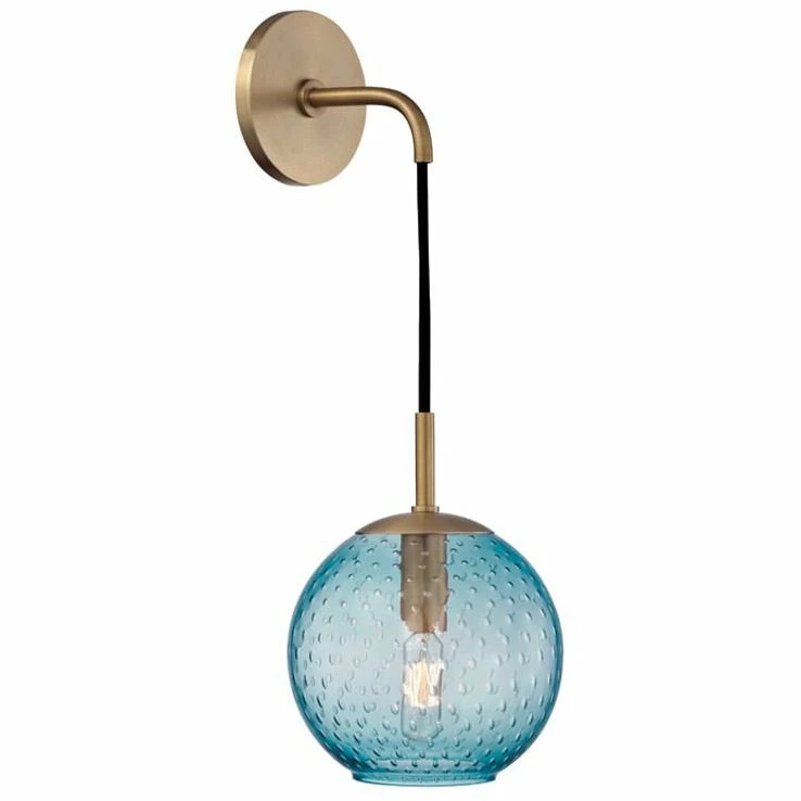 The Rousseau Wall Sconce offers a stunning fixture with blue glass and aged brass hardware.Â