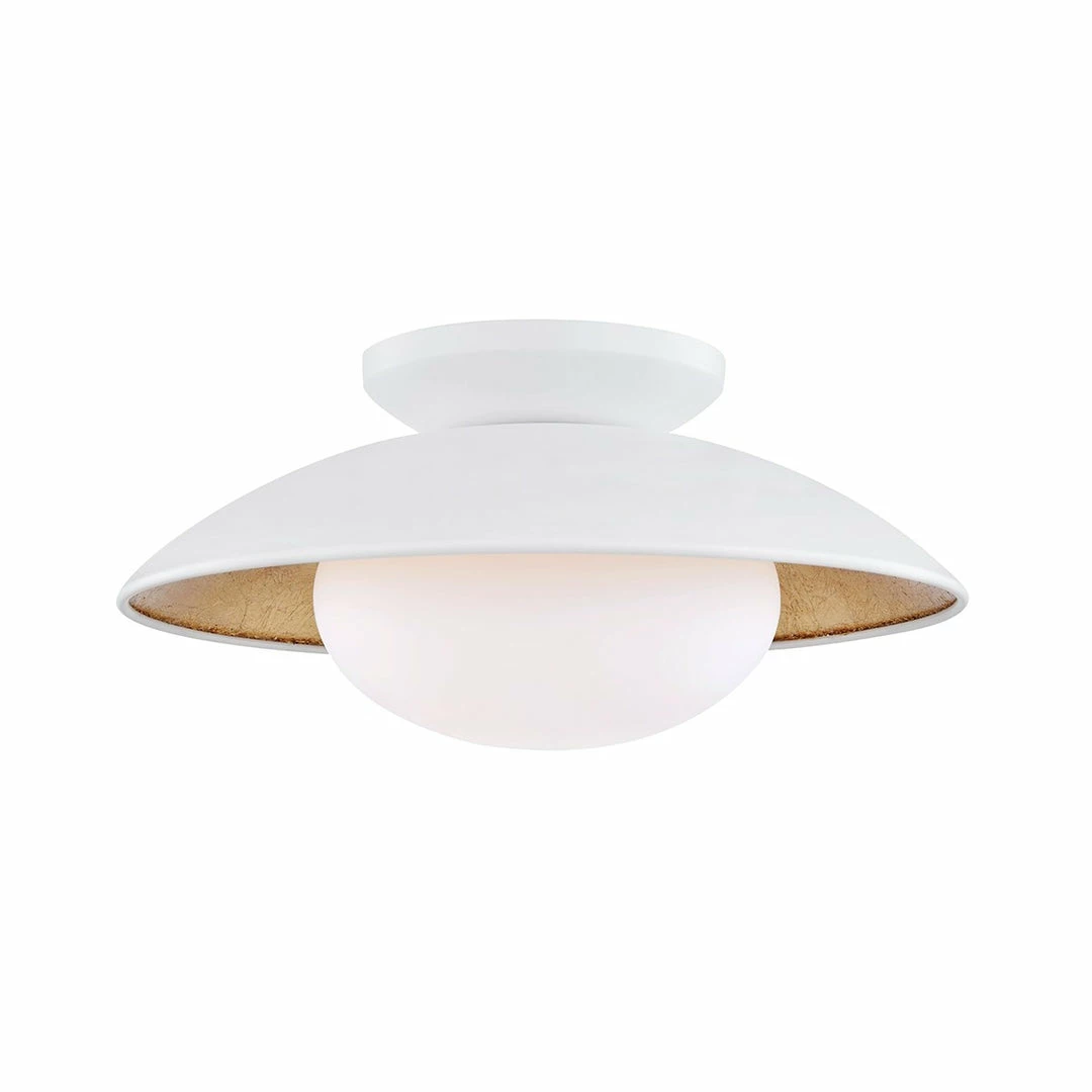 Gold leaf gives this piece the extra lustre and texture. These textures of the gold leaf finish give rich contrast to the matte black and white finishes on the exterior, while also making so beautifully reflective the light. You may mount Cadence as either a flush mount or a wall sconce.