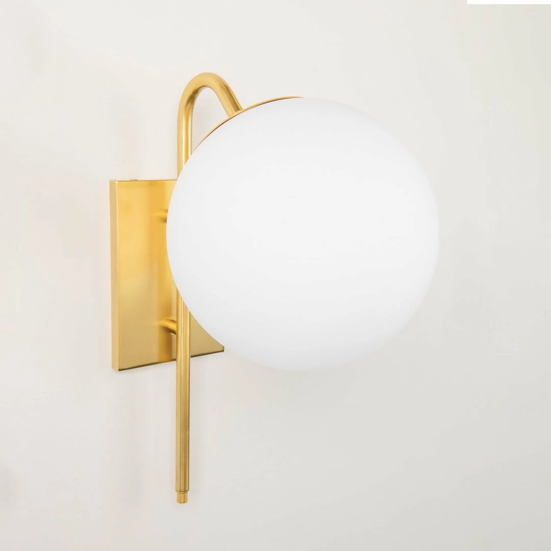 Ingrid is globe lighting with a literal twist. Large opal matte globes jut from the ends of just-barely-bent gooseneck arms to cast a wide, warm glow. Available as a wall sconce or six-light, double-tier chandelier.