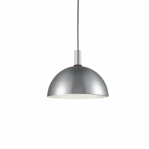 Single-lamp pendant with aluminum dome shade showcasing powder-coated or plated finishes with metal details and a matte white interior. Exterior shade colors are black, brushed nickel, or white. Suspended by cloth cable. Available in three sizes.