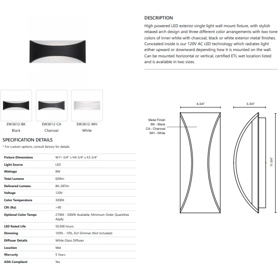 High powered LED exterior single light wall mount fixture, with stylish relaxed arch design and three different color arrangements with two tone colors of inner white with charcoal, black or white exterior metal finishes. Concealed inside is our 120V AC LED technology which radiates light either upward or downward depending how it is mounted on the wall. Can be mounted horizontal or vertical, certified ETL wet location listed and is available in two sizes.