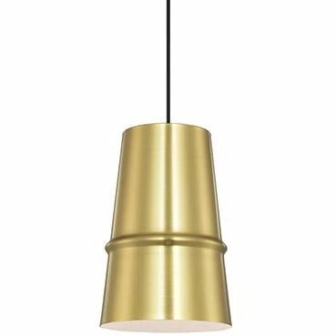 Single-lamp pendant with conical aluminum shade showcasing powder-coated finishes against a matte white interior. Exterior shade colors are black, gray, white or blue. Metallic exterior options are brushed nickel or gold. Suspended by cloth cable.