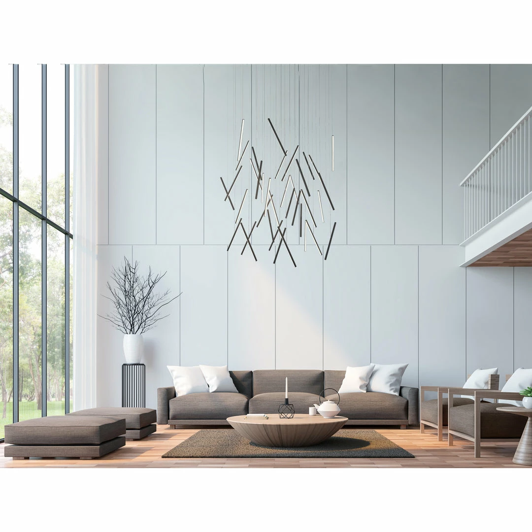 The primary component of the Chute series is a slim round rod illuminated along the entirety of its length. The opal silicon diffuser radiates soft LED light outward from the axis of the lamps and completes the cylindrical shape. Used in angled repetition the fixture becomes increasingly energetic creating a field of radiant floating lines. Individual height adjustment of the various linear elements allows for user customization and an abundance of potential compositions. Available in several sizes and multiple finishes.