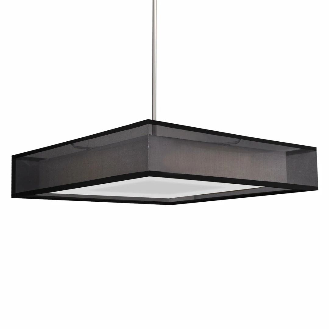 The black or white organza shade that covers the concealed Aluminum and Steel chassis gives depth and structure to this square shaped pendant lamp. Each edge of the square lamp shade is 19-5/8 and is attached to the ceiling with a single stem. LEDs are efficiently diffused with a white acrylic panel – always a glow never a glare.