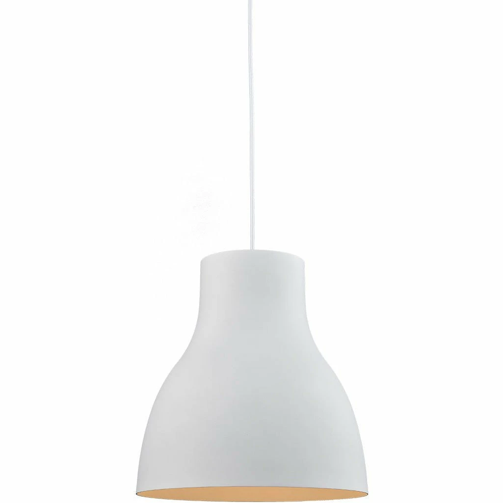 Single-lamp pendant with tapered aluminum shade showcasing powder-coated finishes. Exterior shade colors are either black, gray or white, with matte white interior. Suspended by cloth cable. Available in three sizes.