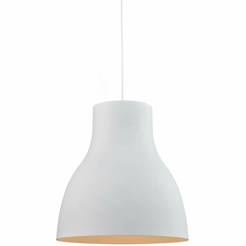 Single-lamp pendant with tapered aluminum shade showcasing powder-coated finishes. Exterior shade colors are either black, gray or white, with matte white interior. Suspended by cloth cable. Available in three sizes.