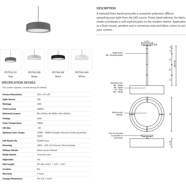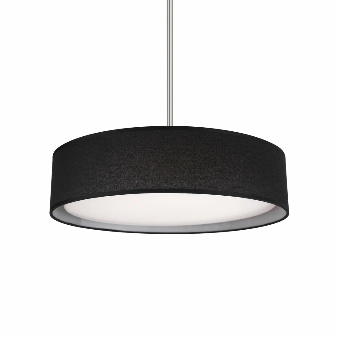 A textured linen band surrounds a concentric polymeric diffuser spreading even light from the LED source. Finely hand-tailored, the fabric shade contributes a soft sophistication to the modern interior. Applicable as a flush mount, pendant and in numerous sizes and fabric colors to suit your context.