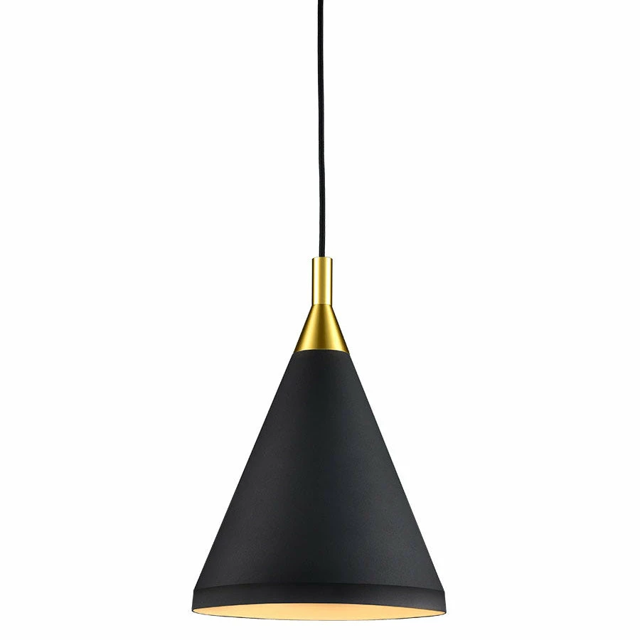 Single lamp pendant with conical aluminum shade with fine powder-coated or plated finishes with contrasting finial. Exterior shade colors are black or white with gold detail or brushed nickel with black detail. Suspended by cloth cable.