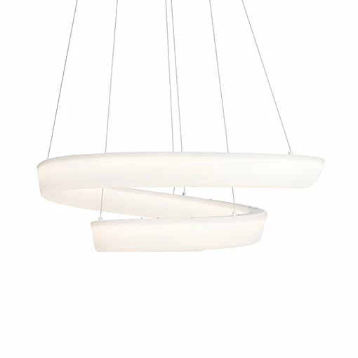 A floating spiral of diffusive light the FLEUR series is both minimal and adaptive. The asymmetrical flowing design of the LED chandelier allows for a unique adjustment, the fixture may remain planar or expand upward to resemble a helix. Available in 3 distinct sizes.