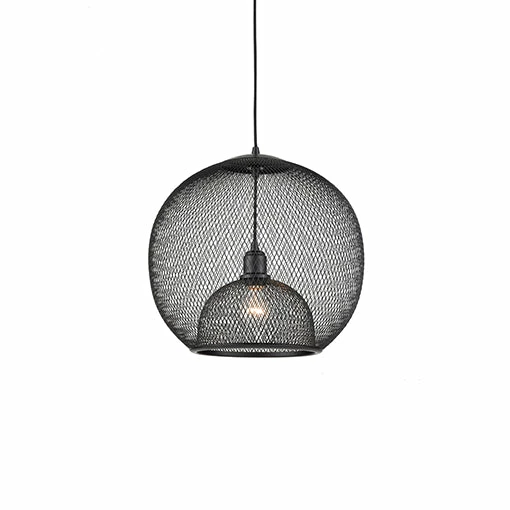 Single lamp pendant with spherical powder-coated wire mesh shade. Color configurations include uniform black, white or an exterior black or white mesh with inner gold mesh. Suspended by matching cable. Available in 2 sizes.
