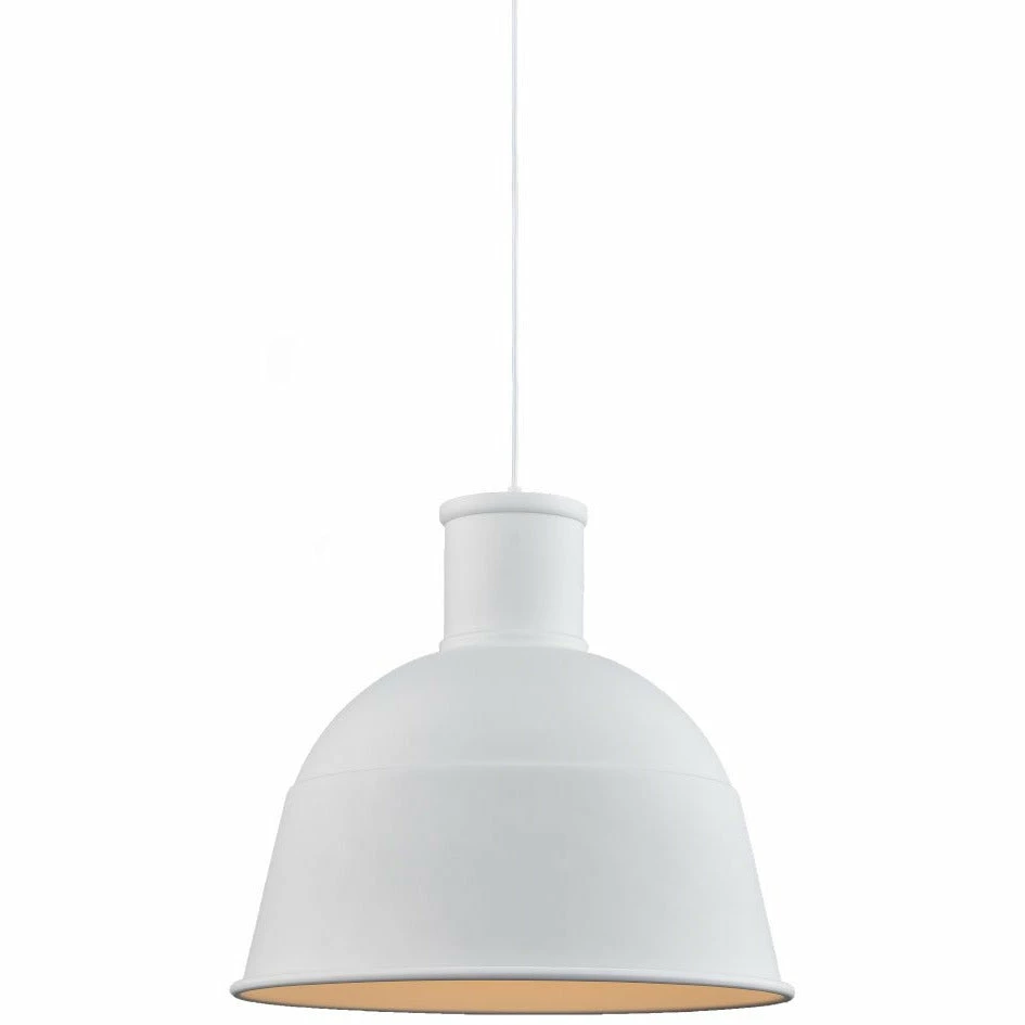 Single lamp pendant with aluminum dome shade showcasing powder-coated finishes. Exterior shade colors are black, white or blue with matte white interior. Suspended by cloth cable to a maximum 120″ length. Available in 3 sizes.