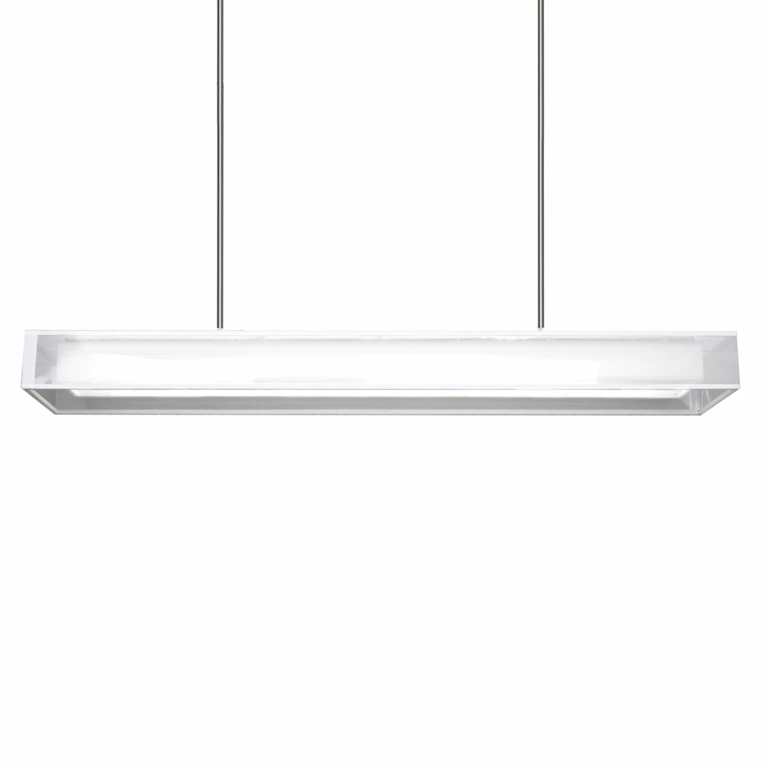 The white organza shade that covers the concealed Aluminum and Steel chassis gives depth and structure to this rectangular shaped pendant lamp. The long edge of the rectangular lamp shade measures 54 inches and is attached to the ceiling with two rods. LEDs are efficiently diffused with a white acrylic panel – always a glow never a glare.