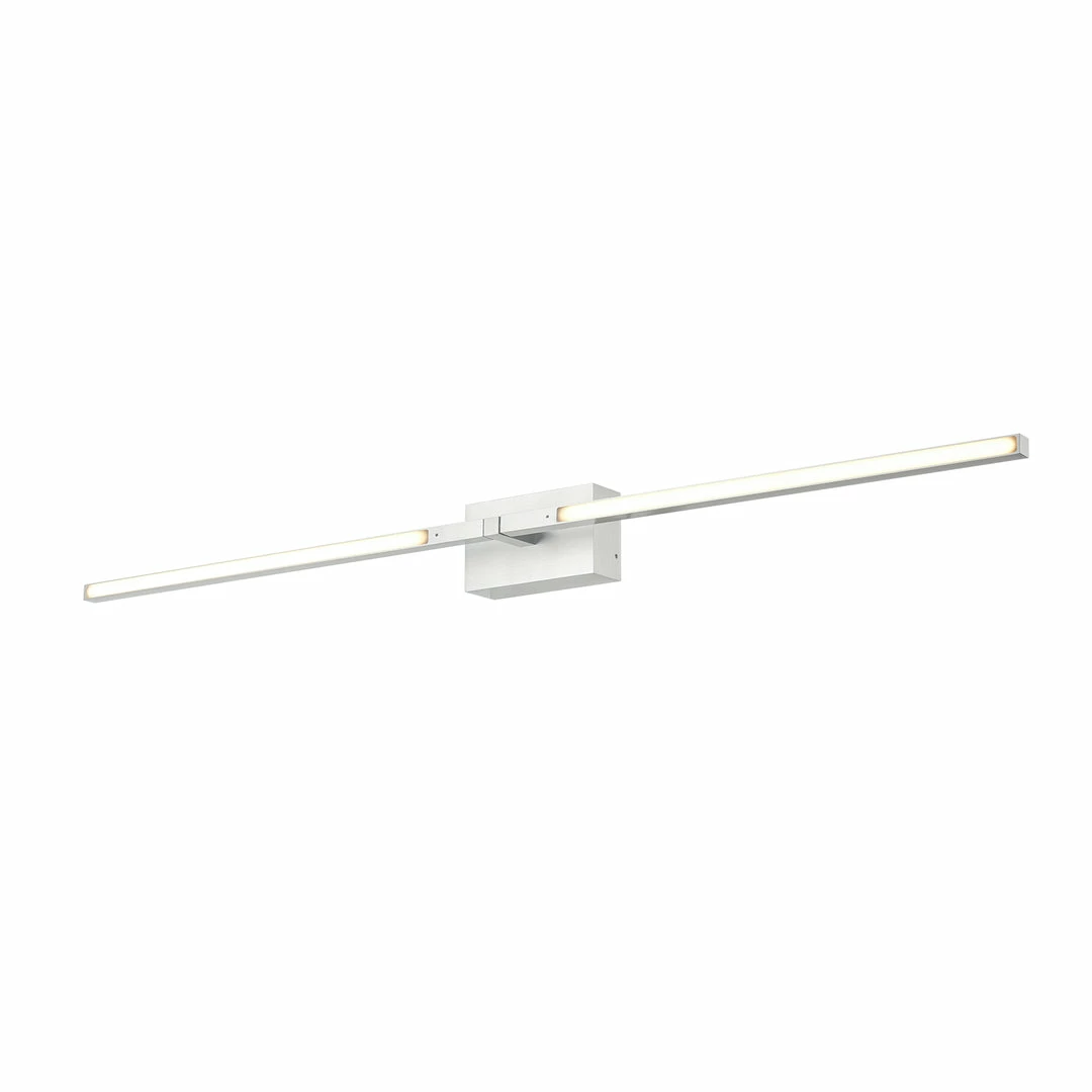Dual square profile linear aluminum arms with rectangular wall mount. Inset opal polymeric diffusers. Finely textured plate or powder-coated finish. Wall emitting lights with rotational adjustment.