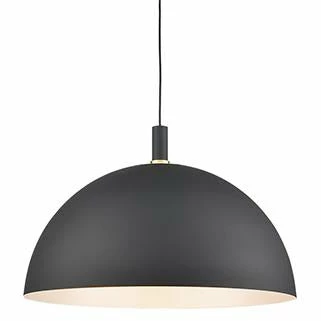 Single-lamp pendant with aluminum dome shade showcasing powder-coated or plated finishes with metal details and a matte white interior. Exterior shade colors are black, brushed nickel, or white. Suspended by cloth cable. Available in three sizes.