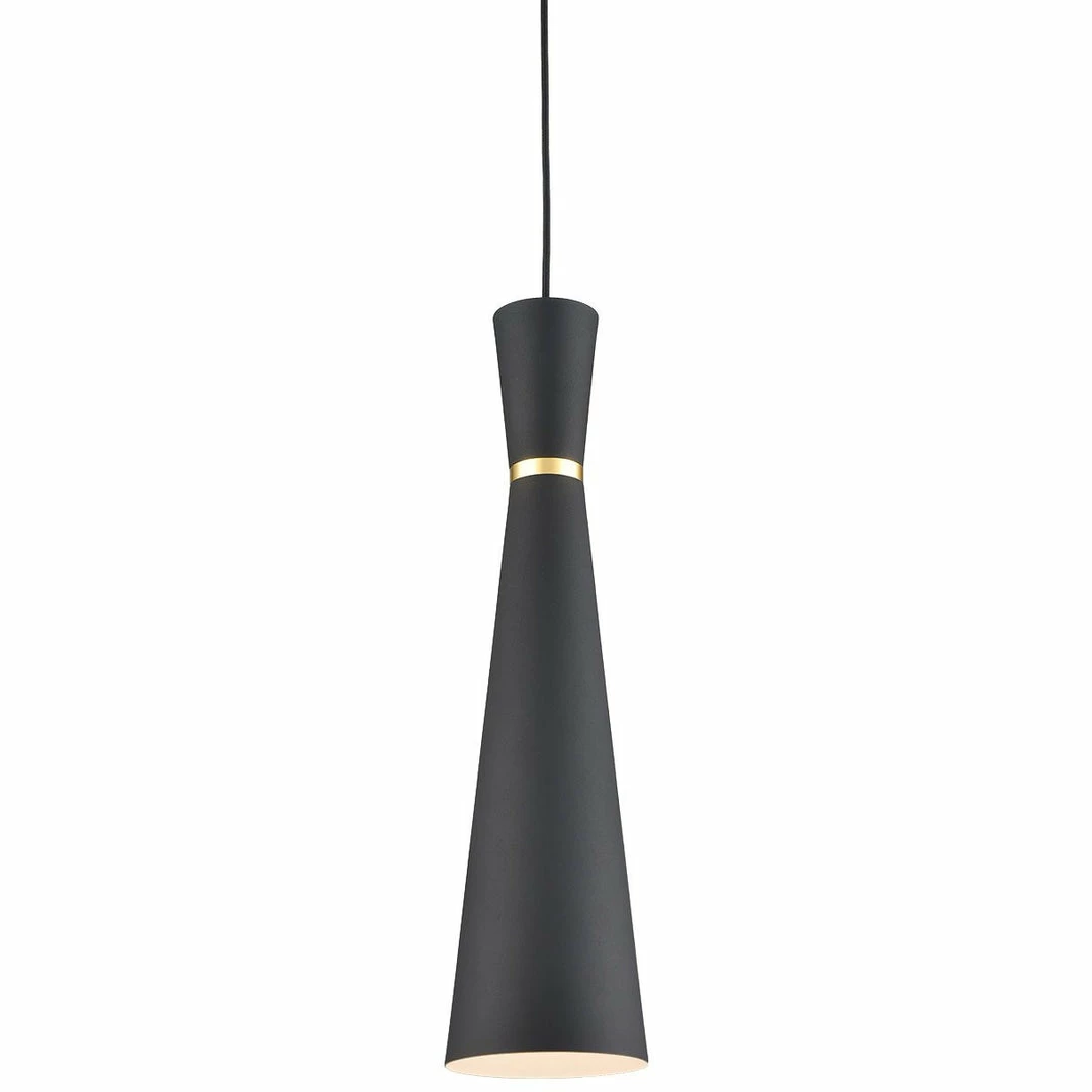 Single-lamp pendant with conical aluminum shade with fine powder-coated finishes and anodized gold ring detail. Exterior shade colors are white or black, with matte white interior. Suspended by cloth cable. Available in 3 sizes.