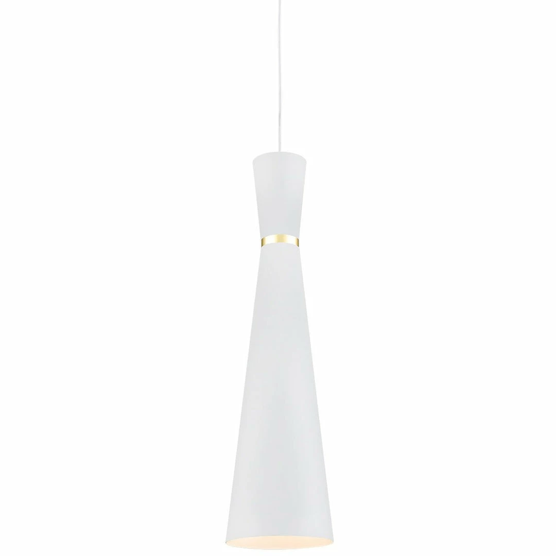 Single-lamp pendant with conical aluminum shade with fine powder-coated finishes and anodized gold ring detail. Exterior shade colors are white or black, with matte white interior. Suspended by cloth cable. Available in 3 sizes.