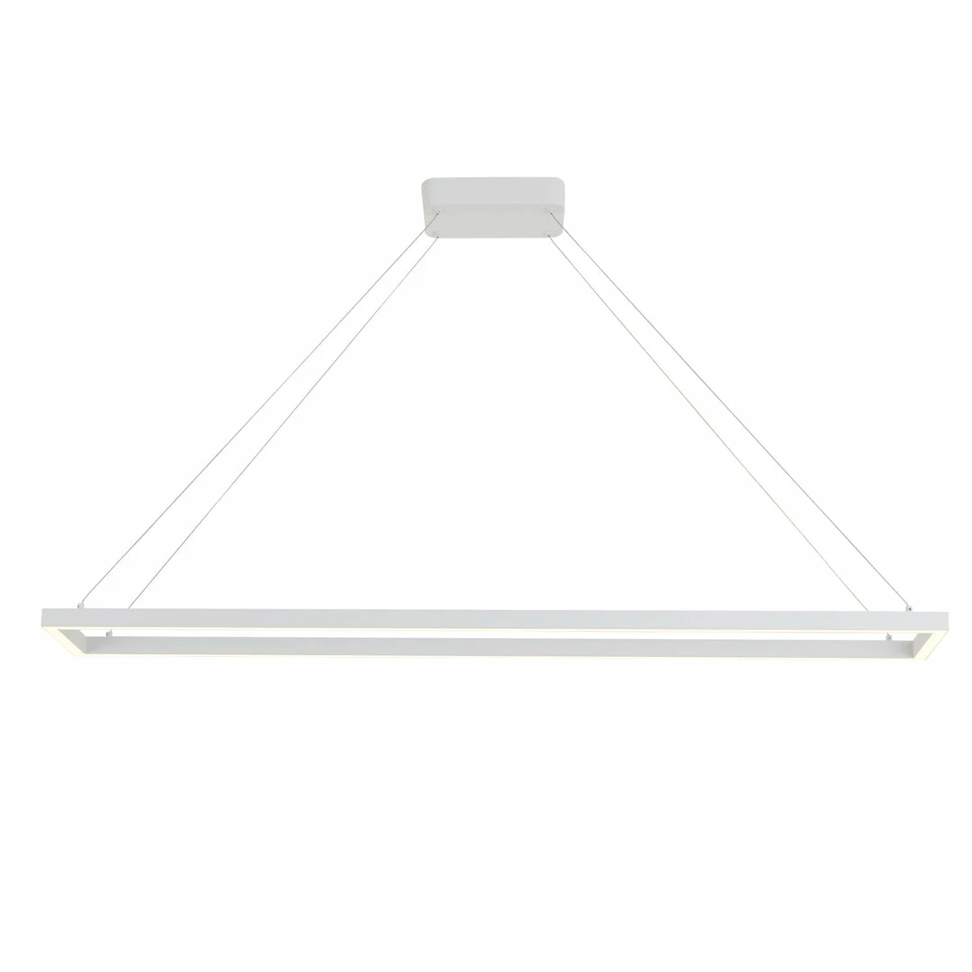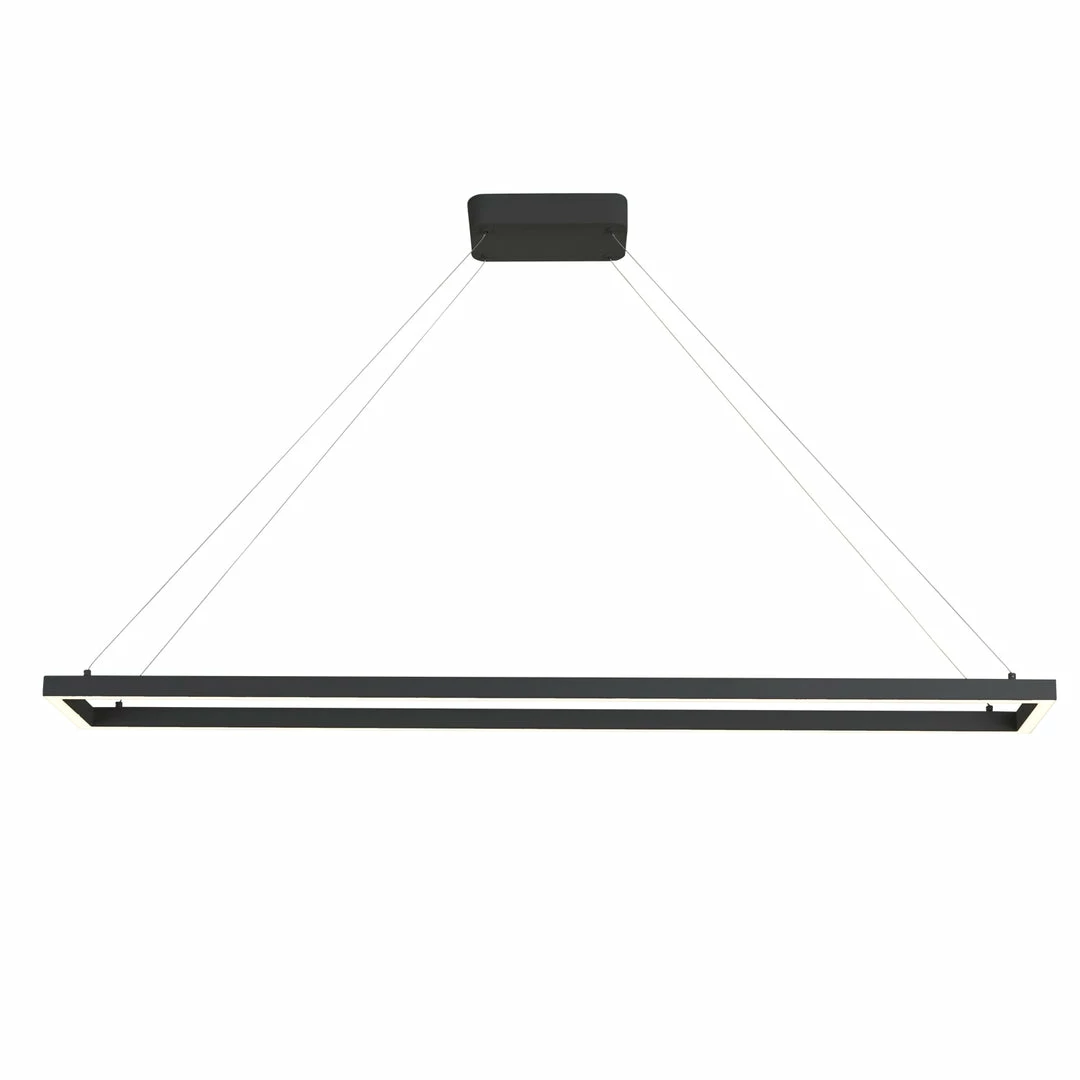 A suspended rectilinear frame emits soft luminance downward from the continuous perimeter opal diffuser. Veiled within the aluminum extrusion is a secondary set of LED lights sending ambient illumination up toward the ceiling. Utilizing a minimal orthogonal outline the PIAZZA series creates an airy effect with the center of the fixture transparent and open. Available as essential singular pendant or dramatic multi-pendant configurations.