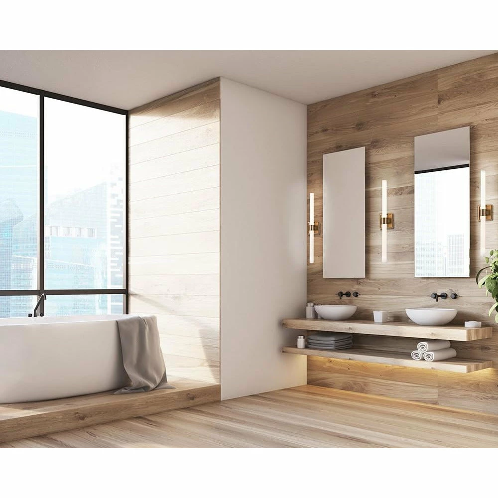 A tubular length of illuminated rod the Rona wall light is supported and clasped with a detailed cylindrical projection. The thick square outline of the attachment plate frames the lamp holder and echoes the refinement of present architectural trim. Available as either a sconce or vanity and in several curated finishes.