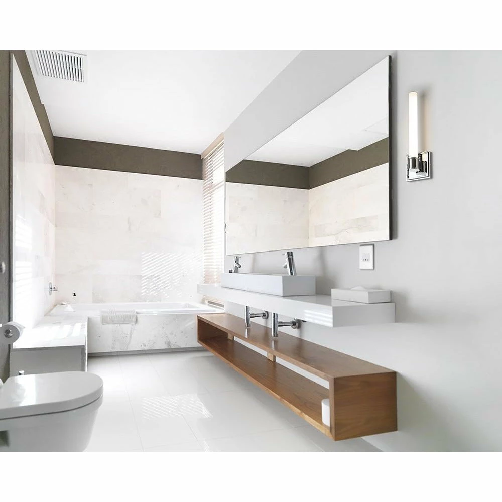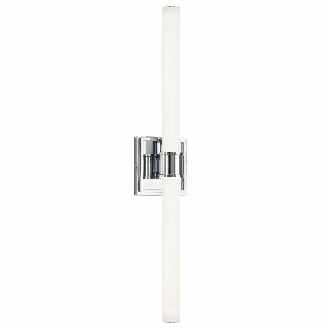 A tubular length of illuminated rod the Rona wall light is supported and clasped with a detailed cylindrical projection. The thick square outline of the attachment plate frames the lamp holder and echoes the refinement of present architectural trim. Available as either a sconce or vanity and in several curated finishes.