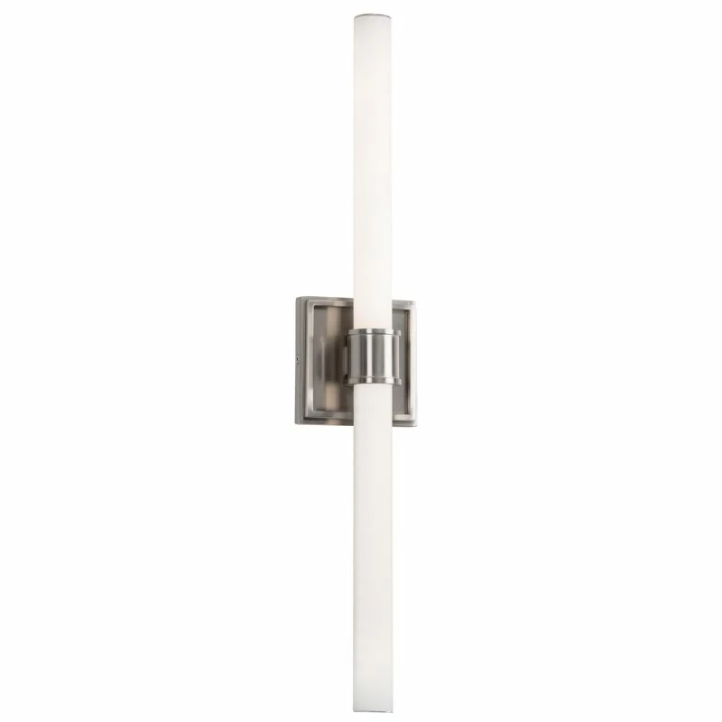 A tubular length of illuminated rod the Rona wall light is supported and clasped with a detailed cylindrical projection. The thick square outline of the attachment plate frames the lamp holder and echoes the refinement of present architectural trim. Available as either a sconce or vanity and in several curated finishes.