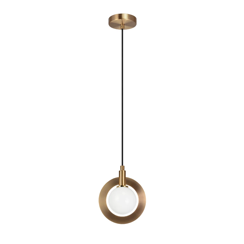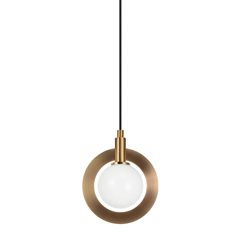 A stunning yet simple pendant designed with circular elements. Astro features Clear or Opal Glass, surrounded by a bold metal ring. Available in 2 finishes: Aged Gold Brass and Black.