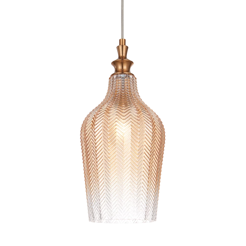 The Renity series features an elegant design of chevron textured glass, matched with either Aged Gold Brass or Smoke finish.These sophisticated pendants will add charm to any space. Available in 2 glass shapes.