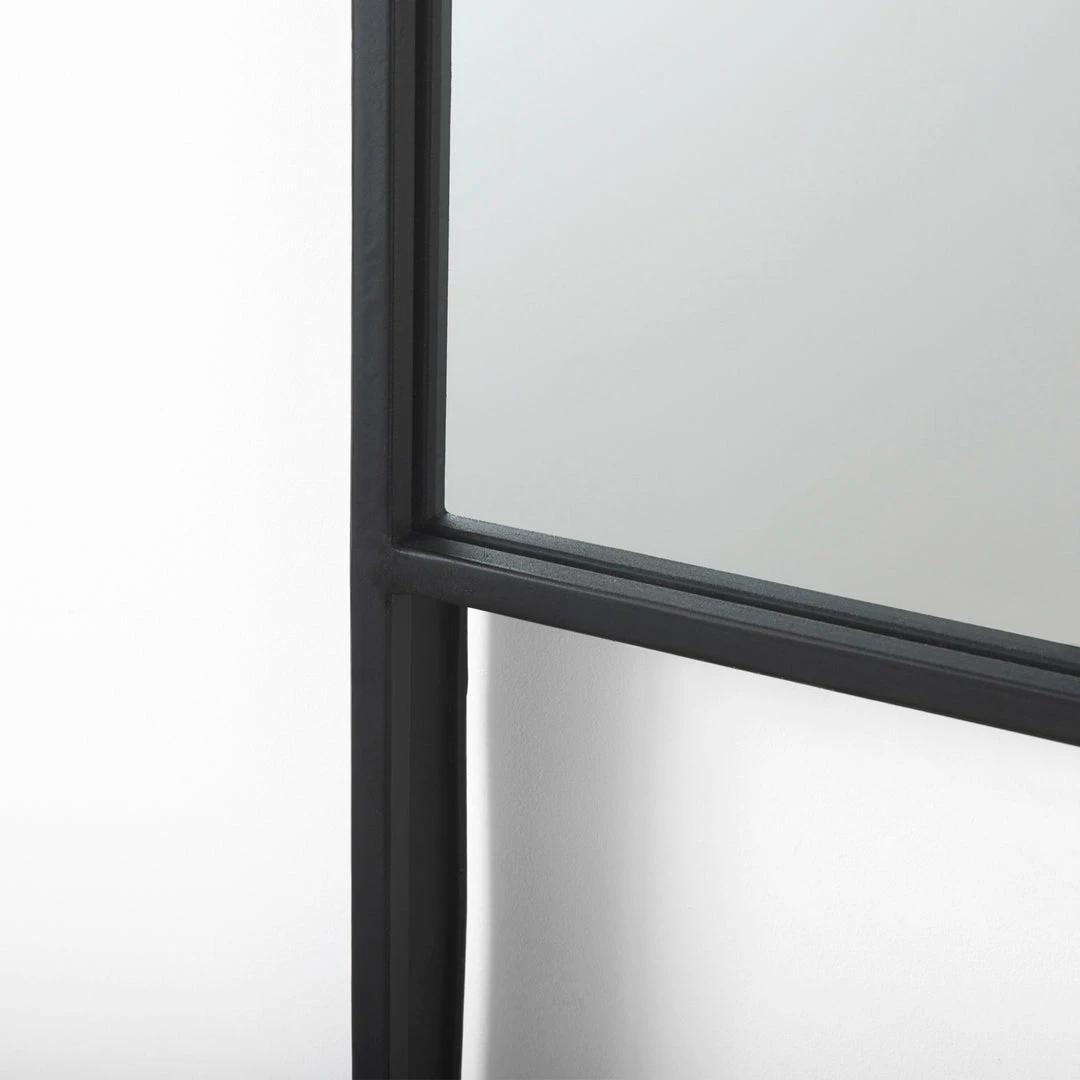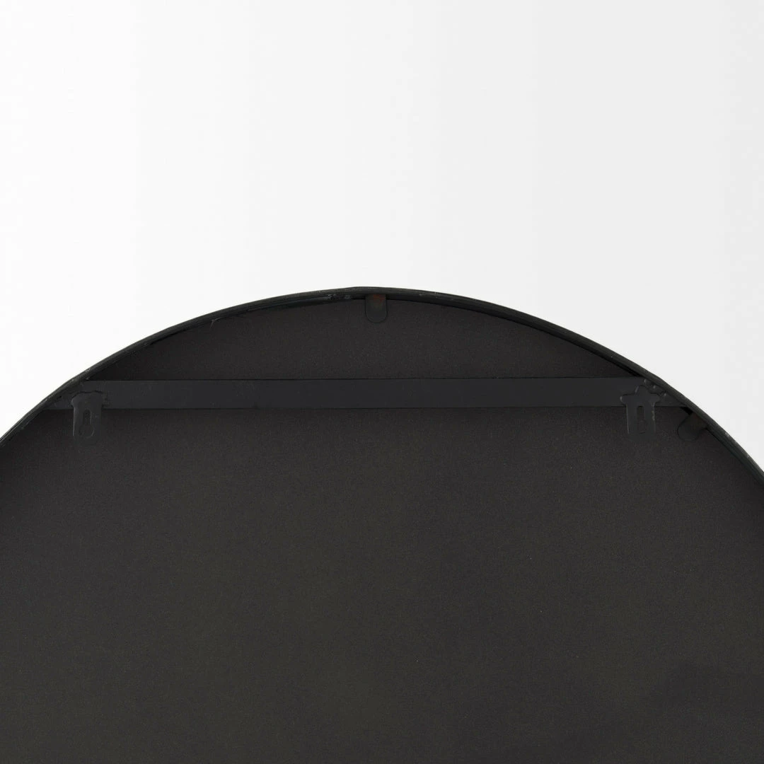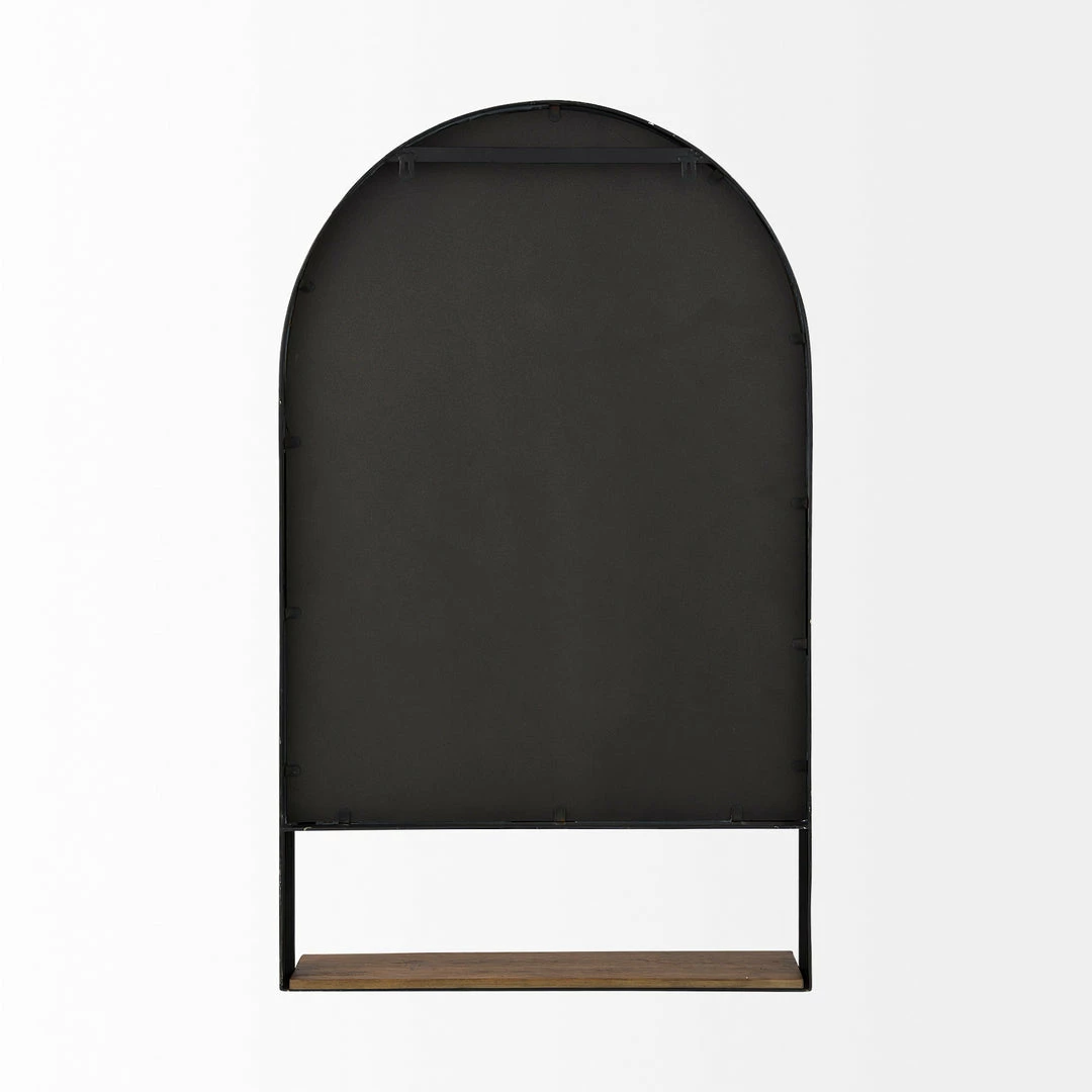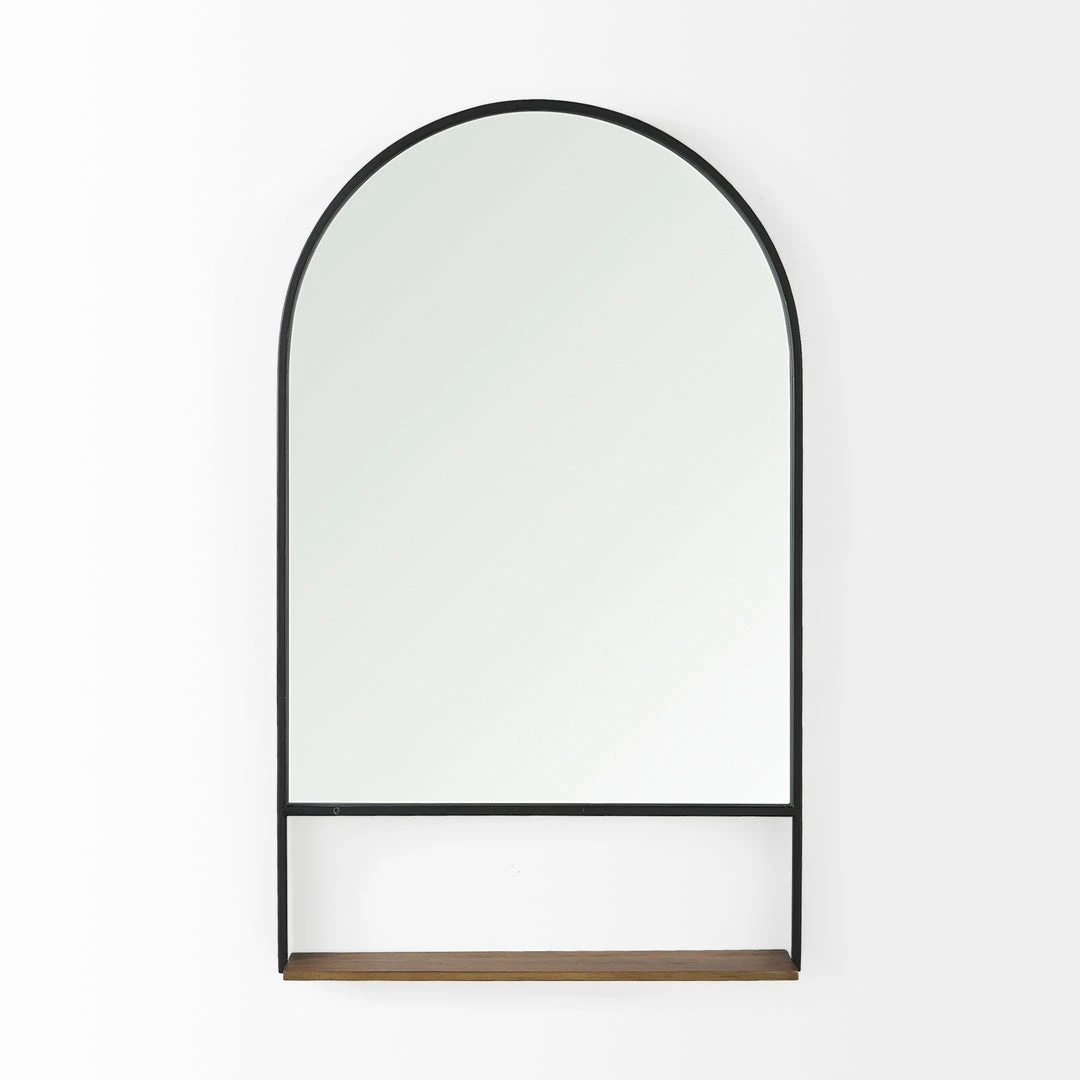 Our Calder arched mirror boasts a clean and simple design with strong curved lines and crisp edges. The black iron frame extends into a solid wood shelf, perfect for keeping everyday essentials within reach or showcasing special items. A sleek silhouette with a touch of wooden warmth, the Calder fits perfectly into modern environments.Â